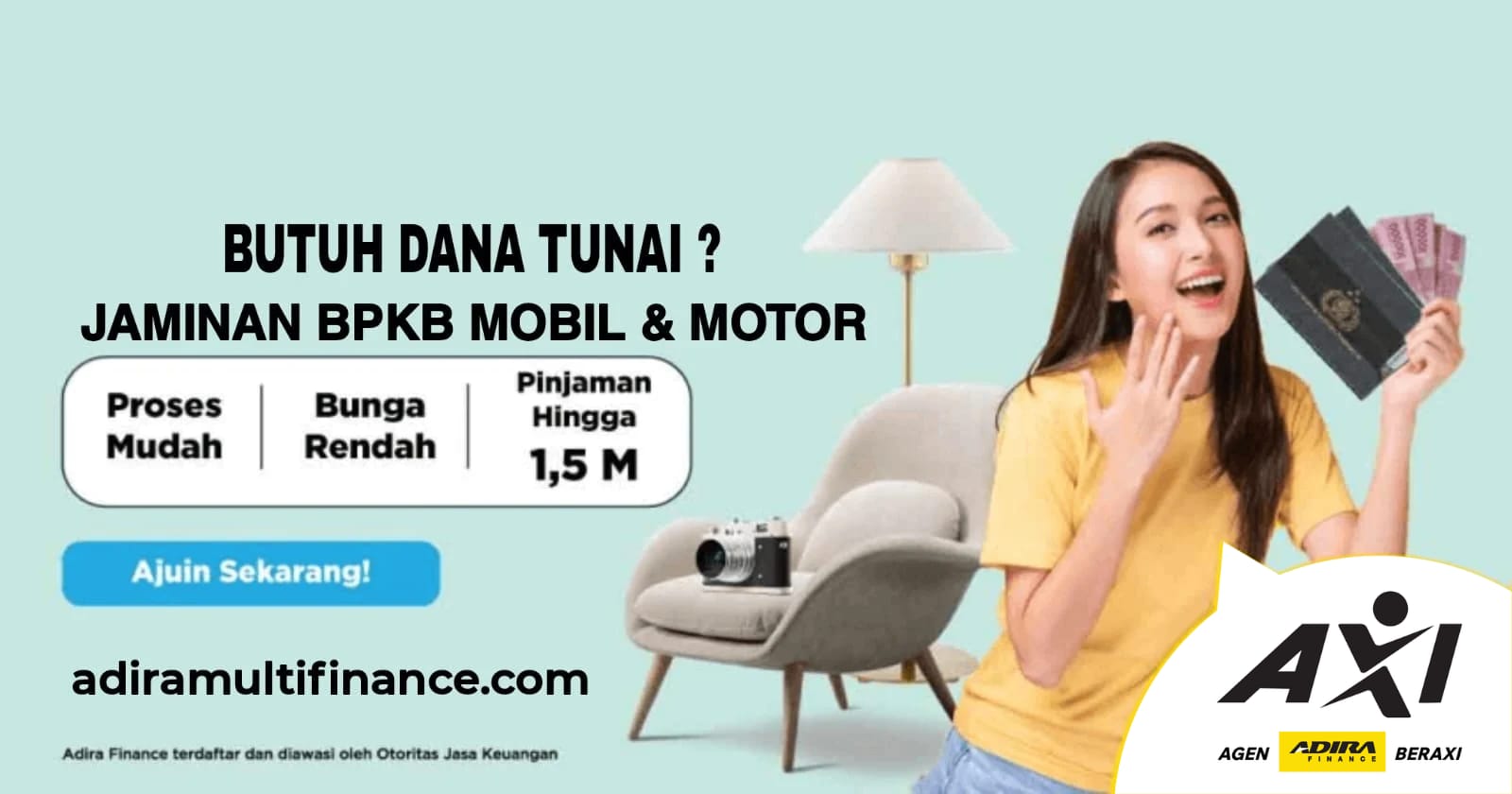 ADIRA Multi Finance menawarkan Fasilitas Pinjaman Dana Tunai dengan Jaminan BPKB Mobil dan Motor yang syaratnya mudah, proses pencairan dana cepat, jaringan pembayaran angsuran yang luas, pilihan perlindungan asuransi yang lengkap, sistem penyimpanan BPKB yang aman, serta layanan yang bersahabat di ratusan kantor cabang/perwakilan, Call Center dan Media Online.